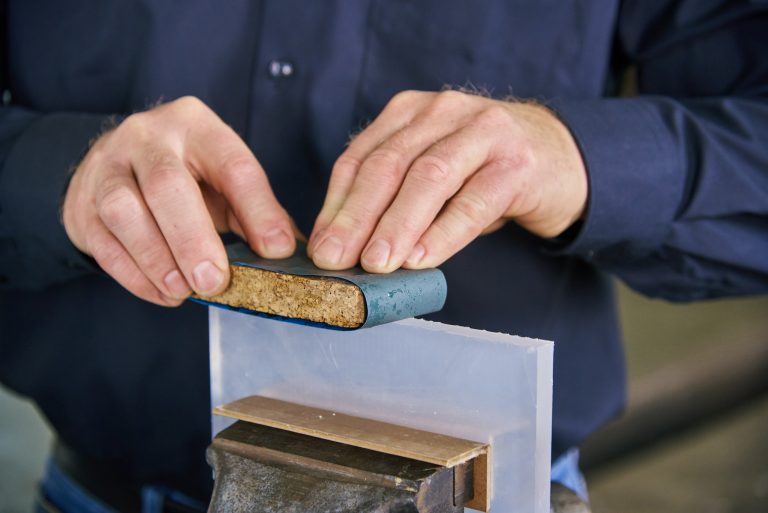- Înfășurați șmirghelul în jurul unui bloc de lemn sau de plută pentru a șlefui marginile tăiate ale PLEXIGLAS®.