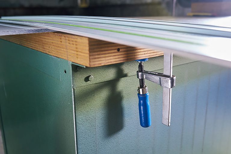 Așezați foaia pe o bază plană. Partea pe care doriți să o despărțiți trebuie să depășească marginea bazei. Fixați materialul cu cleme sau cleme cu șuruburi, de exemplu. Important: Curățați în prealabil baza, astfel încât să nu iasă din ea nicio parte cu muchii ascuțite care ar putea deteriora foaia.